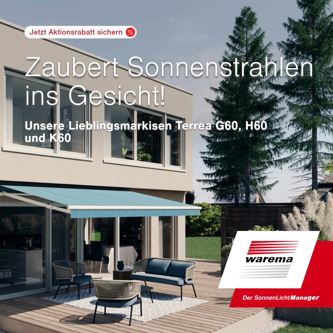 Bei Kauf einer WAREMA Markise aus den Modellreihen WAREMA K60, H60 und G60 erhalten Sie 10 % Aktionsrabatt auf den Warenwert.